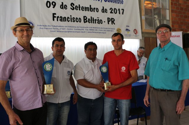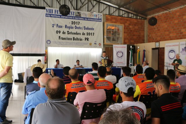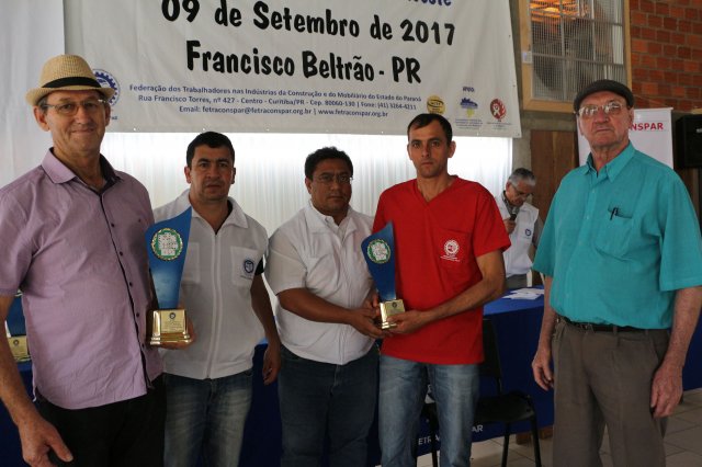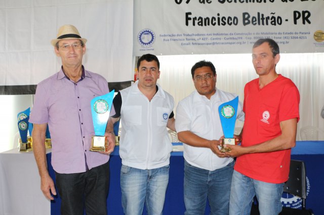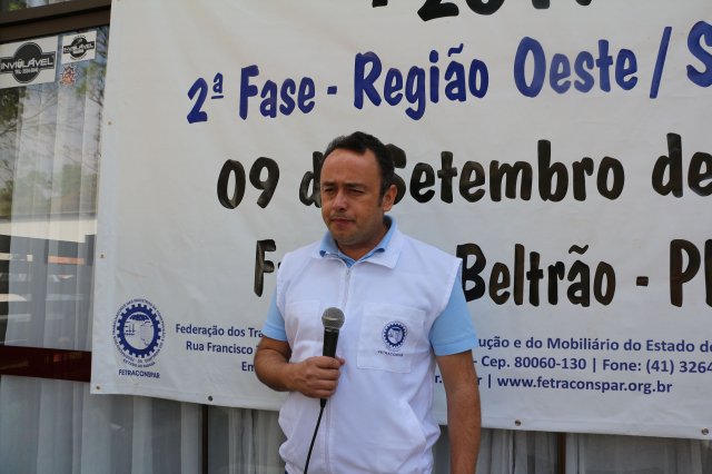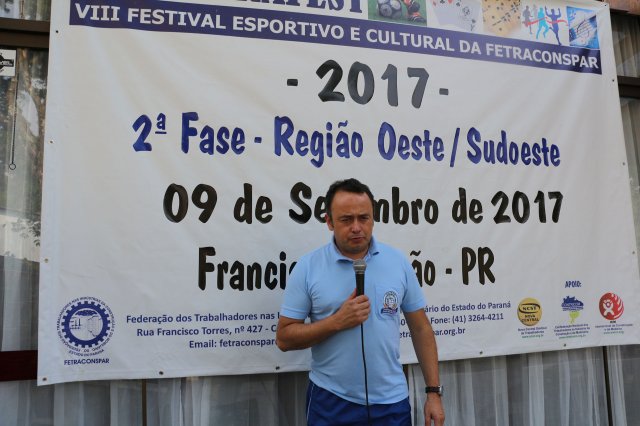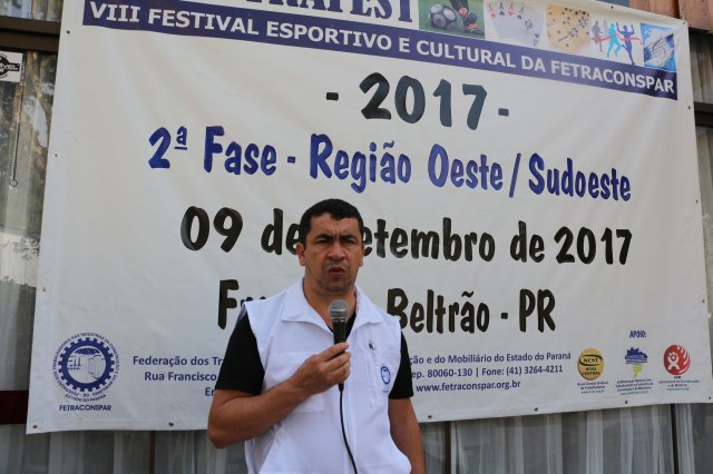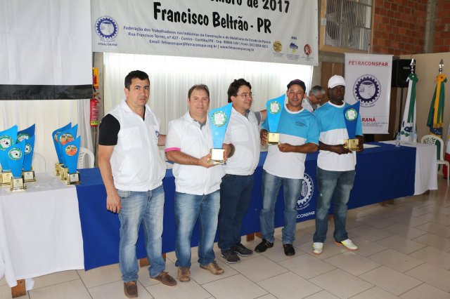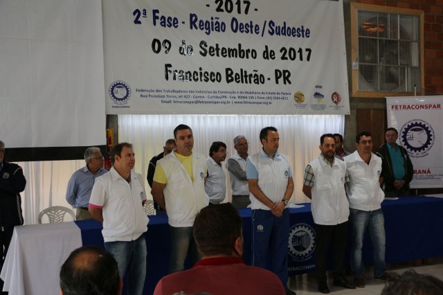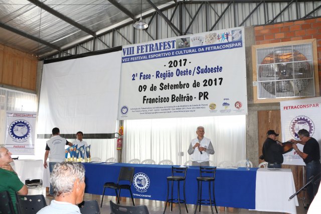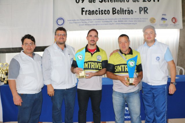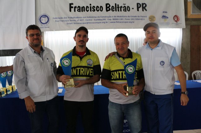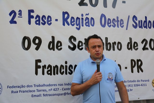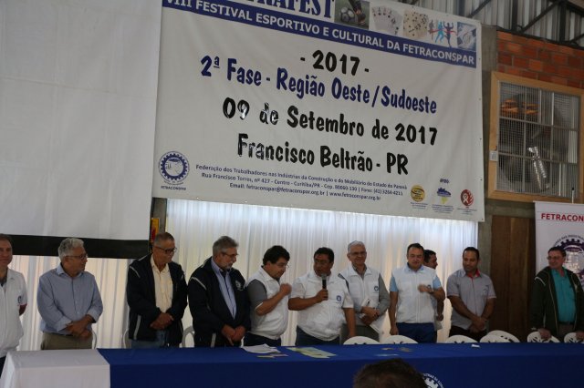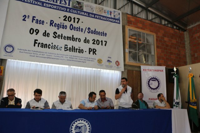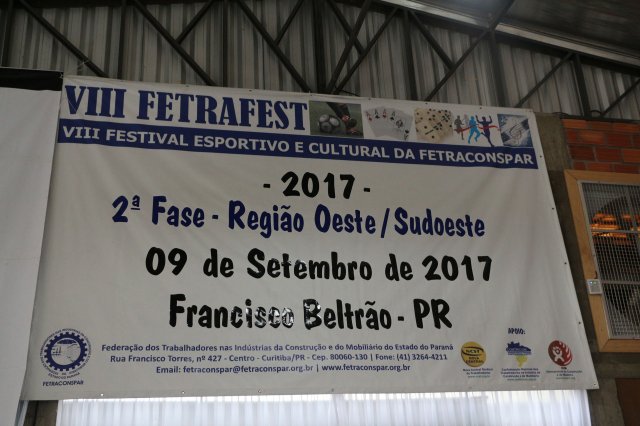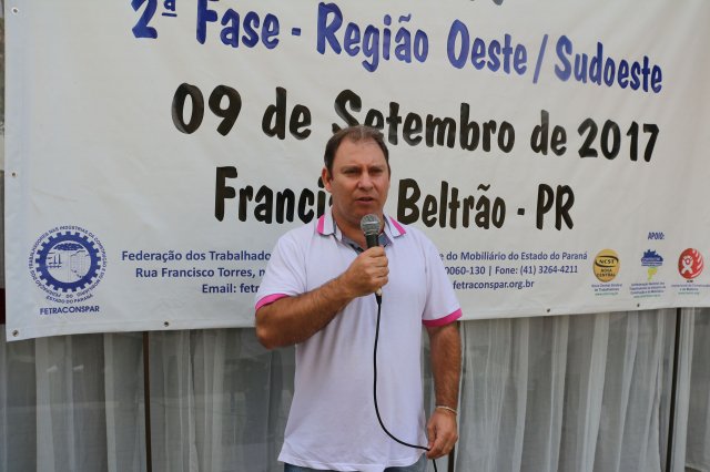 Hoje (09/09) está sendo disputada, na Cidade de Francisco Beltrão, a 2ª Fase do Evento onde participam os sindicados filiados localizados na região Oeste e Sudoeste do Paraná dos quais participam 09 sindicatos: SINTRIMMOC Cascavel, Presidido pelo companheiro Almir Guedes Fernandes; SINTRIVEL Cascavel, Presidido pelo companheiro Roberto Leal Americano; SITRACOCIFOZ, Presidido pelo companheiro Antonio Barros França; SINTRAMADEMÓVEIS FRANCISCO BELTRÃO, Presidido pelo companheiro João Carlos da Silva Machado; SINTRACON FCO. BELTRÃO, Presidido pelo companheiro Osmar Krieger; STICM de Marechal Cândido Rondon, Presidido pelo companheiro Lotário Claas; STICM de Medianeira, Presidido pelo companheiro Climar Ribas dos Santos; STICM de Pato Branco, Presidido pelo companheiro Leandro de Freitas; e o SINTRACON de Toledo, Presidido pelo companheiro Ademir Fogaça. O SINTRACON FCO. BELTRÃO e o SINTRAMADEIRA FCO. BELTRÃO estão sediando o evento este ano.