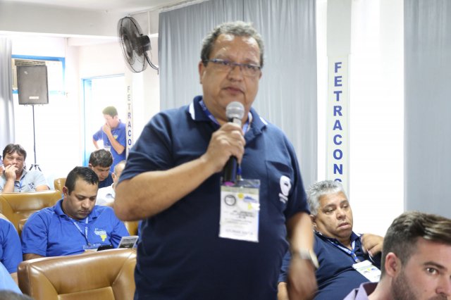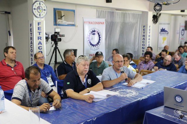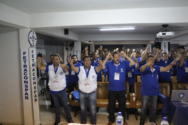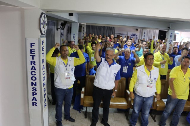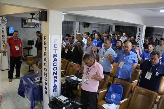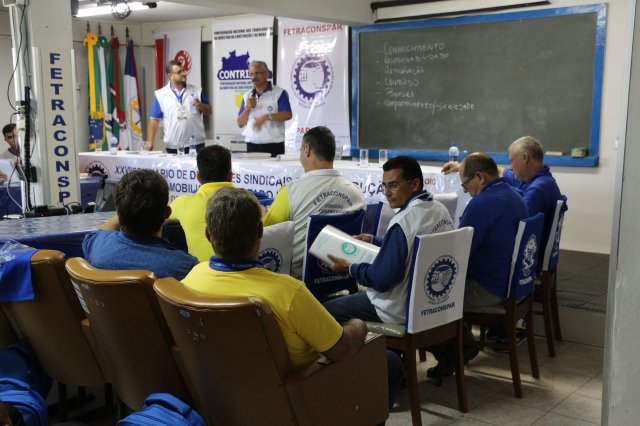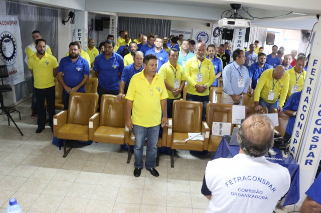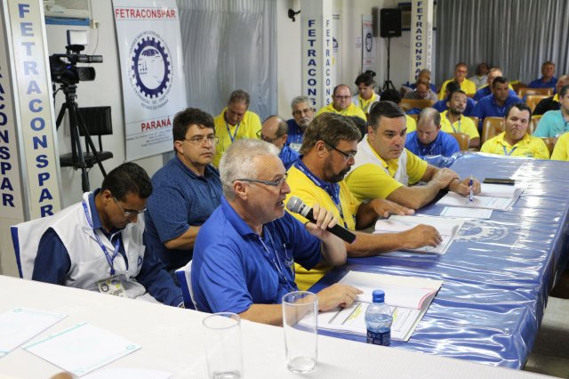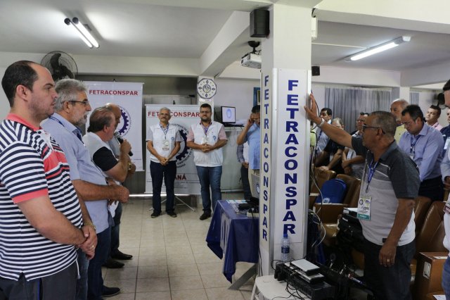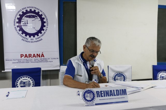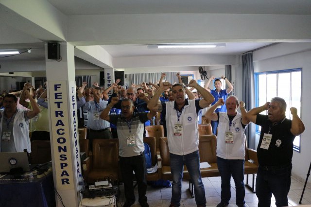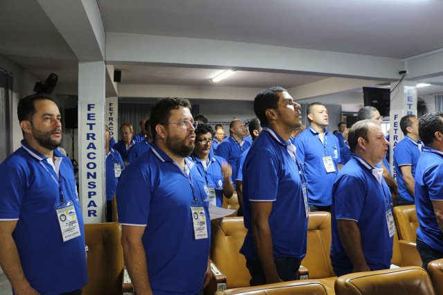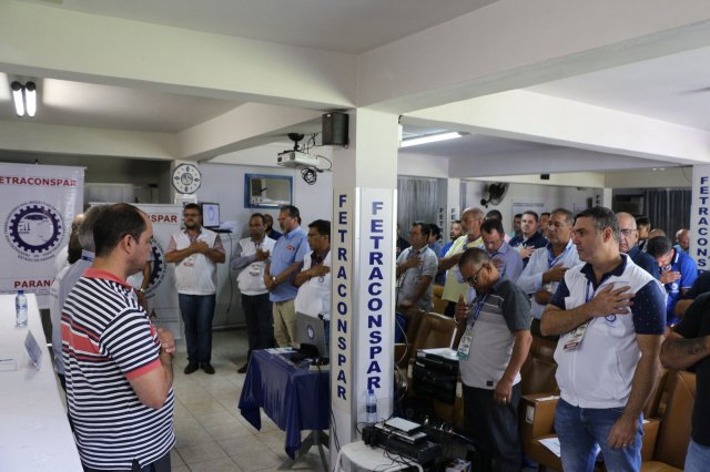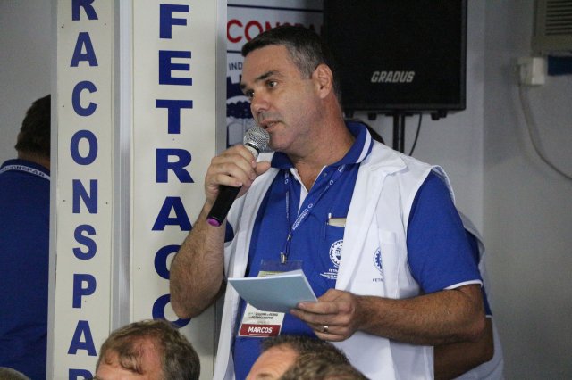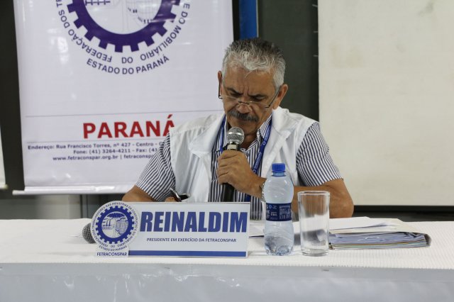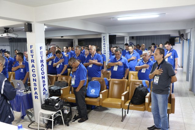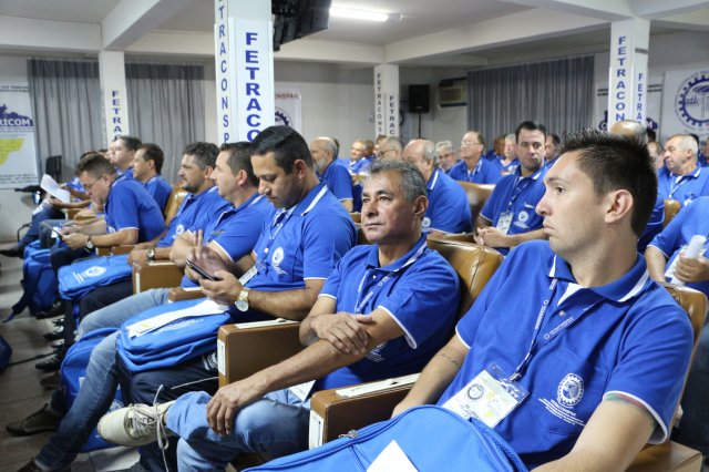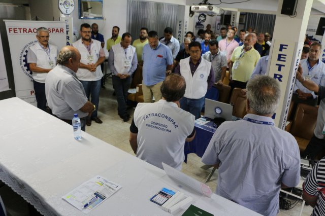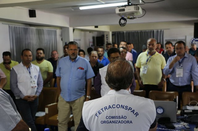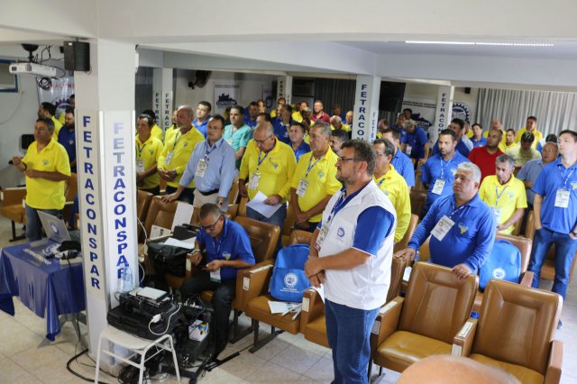 O primeiro dia do Seminário iniciou os trabalhos às 7h30 com o registro fotográfico dos participantes e a filmagem do grito de guerra que é marca de todas as atividades da FETRACONSPAR. Às 8h05, o Presidente em Exercício Reinaldim Barboza Pereira realizou a chamada dos inscritos e iniciou os informes gerais aos presentes. Ao todo, houve 86 inscrições de 38 sindicatos filiados.