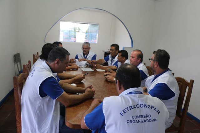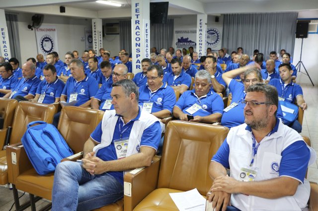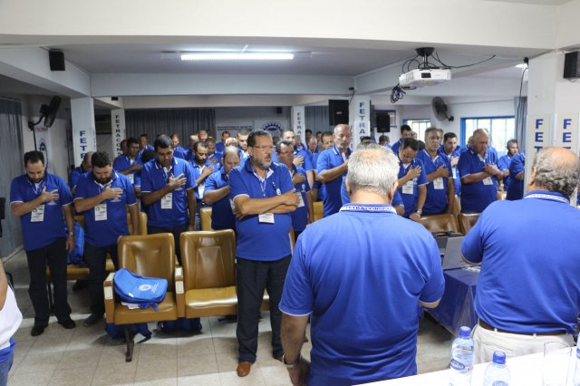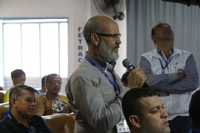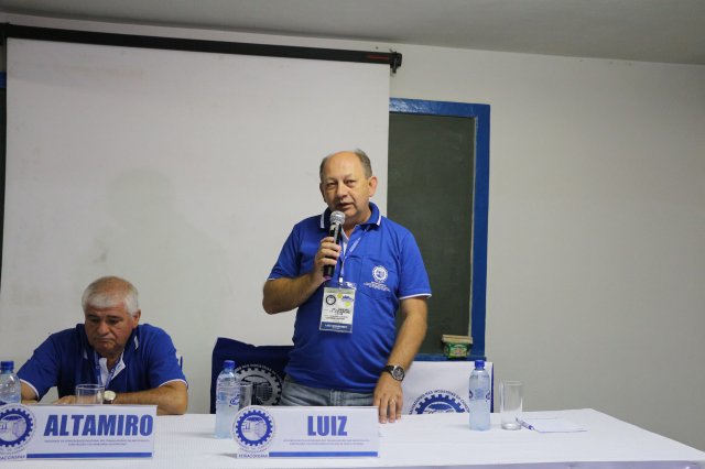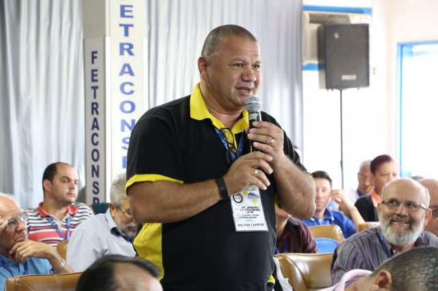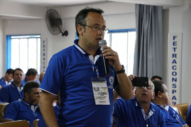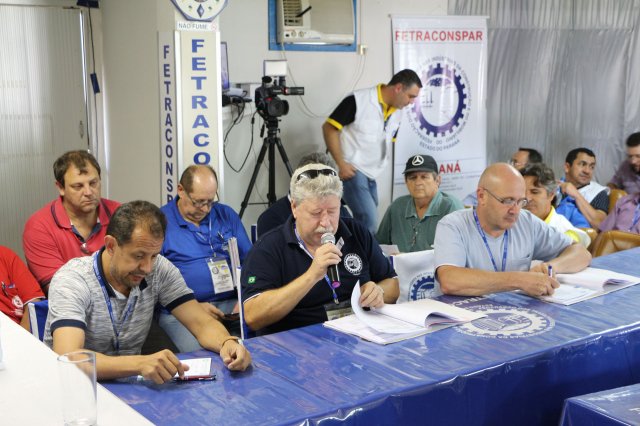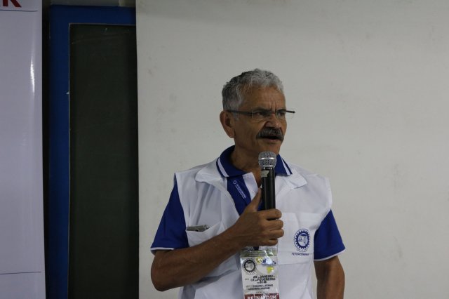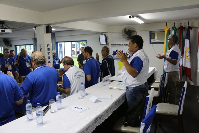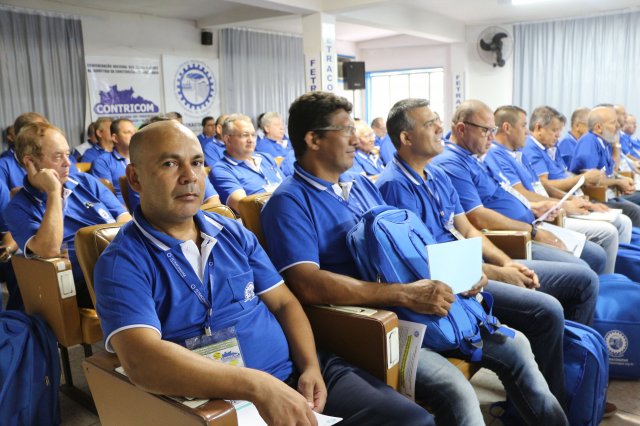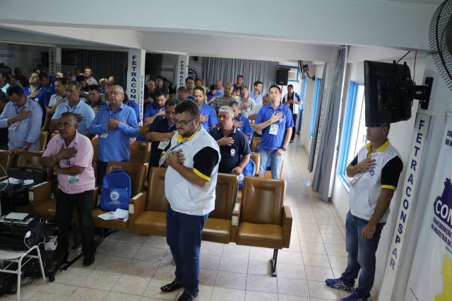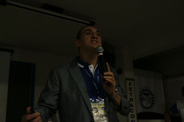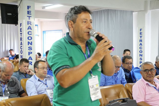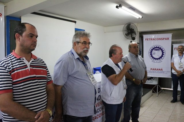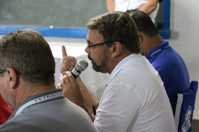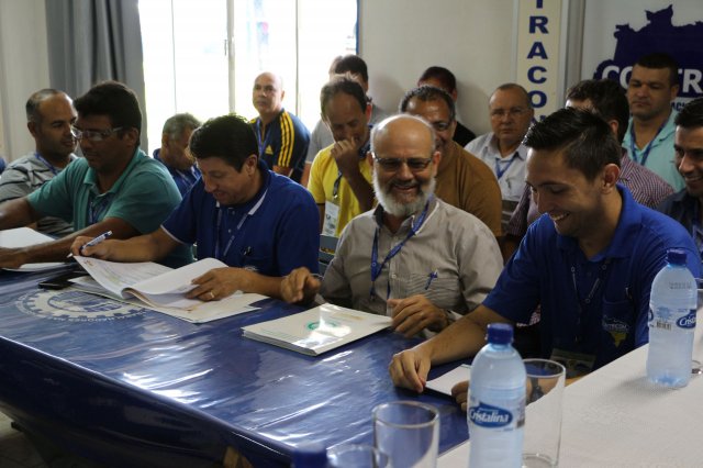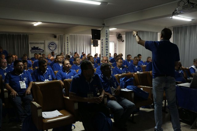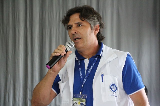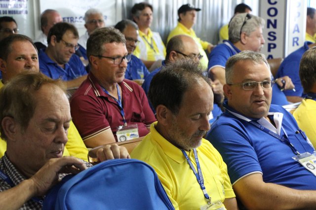 O primeiro dia do Seminário iniciou os trabalhos às 7h30 com o registro fotográfico dos participantes e a filmagem do grito de guerra que é marca de todas as atividades da FETRACONSPAR. Às 8h05, o Presidente em Exercício Reinaldim Barboza Pereira realizou a chamada dos inscritos e iniciou os informes gerais aos presentes. Ao todo, houve 86 inscrições de 38 sindicatos filiados.