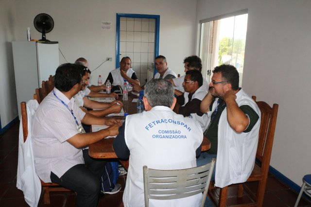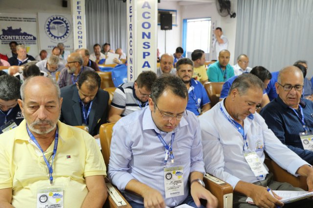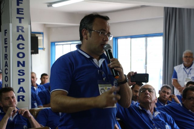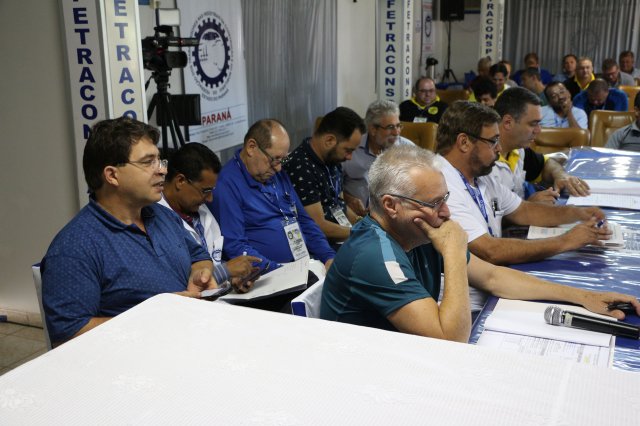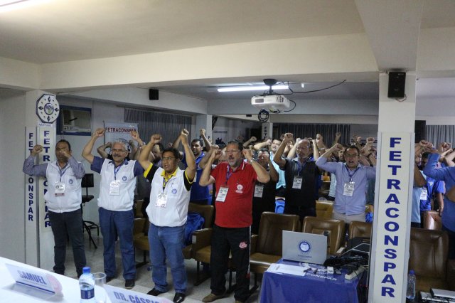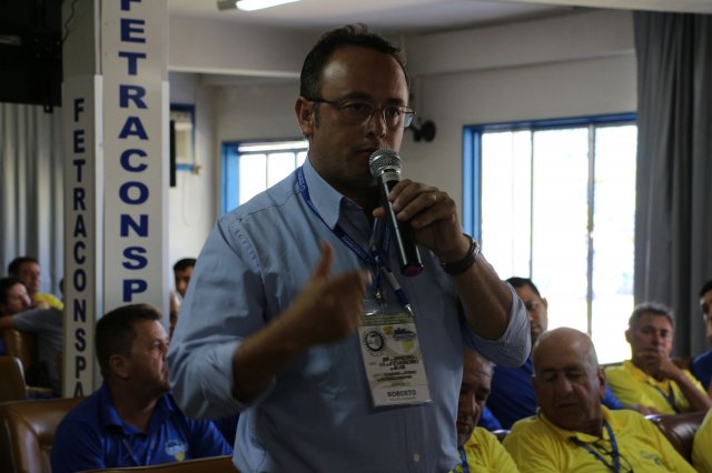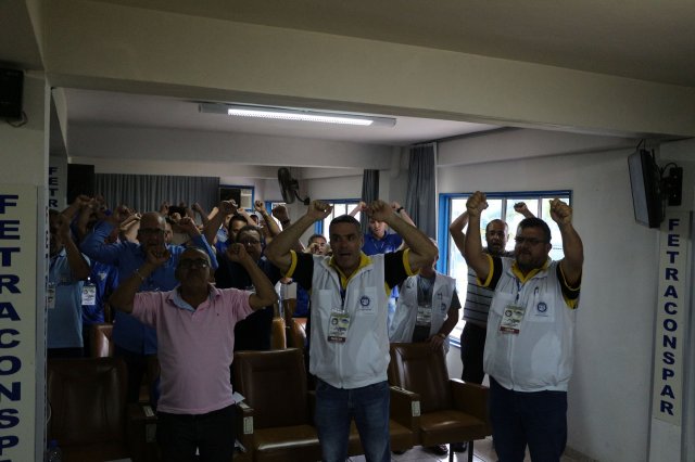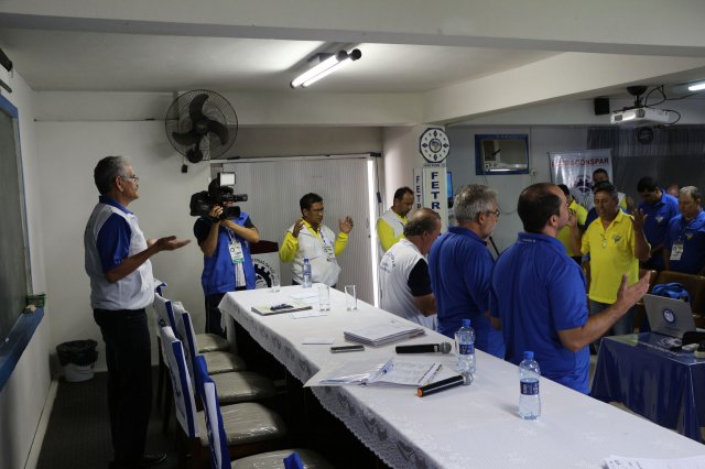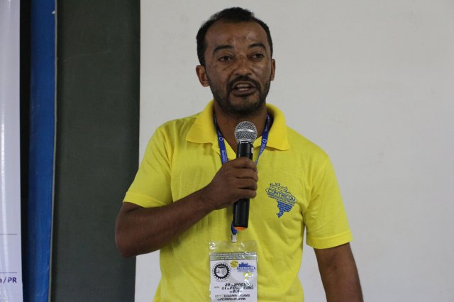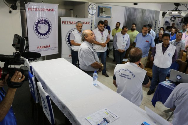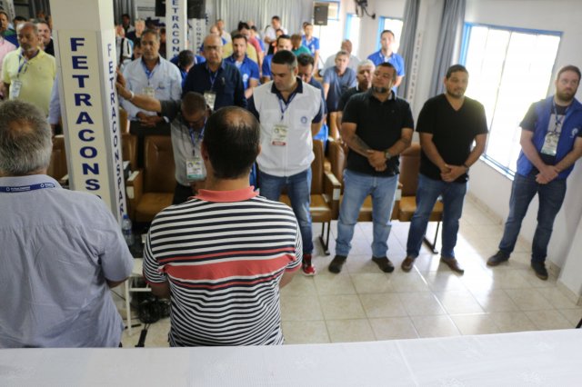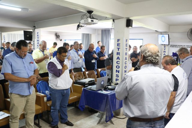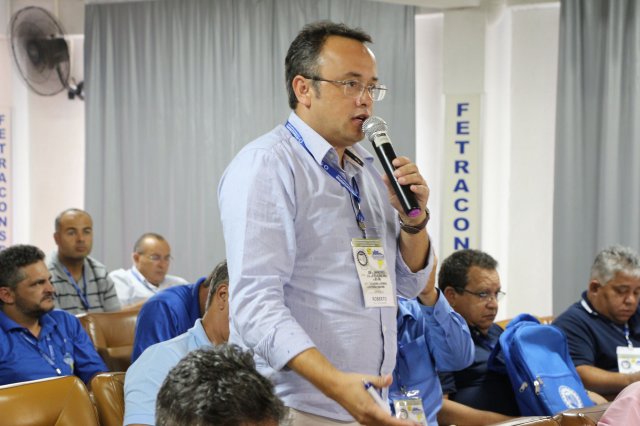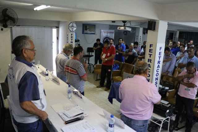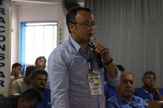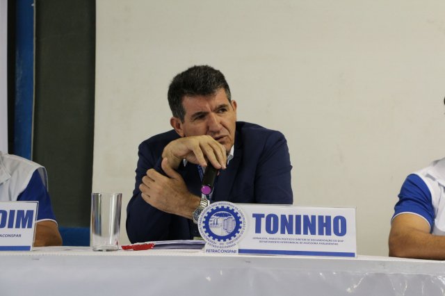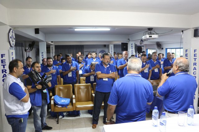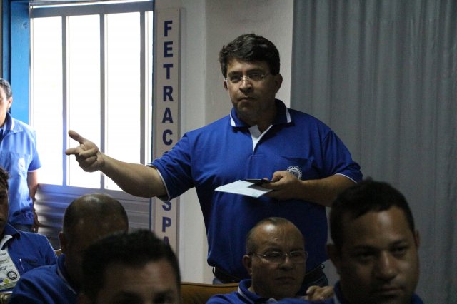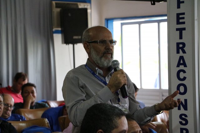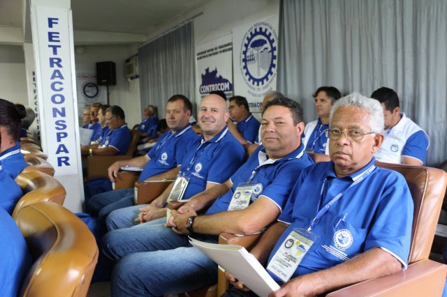 O primeiro dia do Seminário iniciou os trabalhos às 7h30 com o registro fotográfico dos participantes e a filmagem do grito de guerra que é marca de todas as atividades da FETRACONSPAR. Às 8h05, o Presidente em Exercício Reinaldim Barboza Pereira realizou a chamada dos inscritos e iniciou os informes gerais aos presentes. Ao todo, houve 86 inscrições de 38 sindicatos filiados.