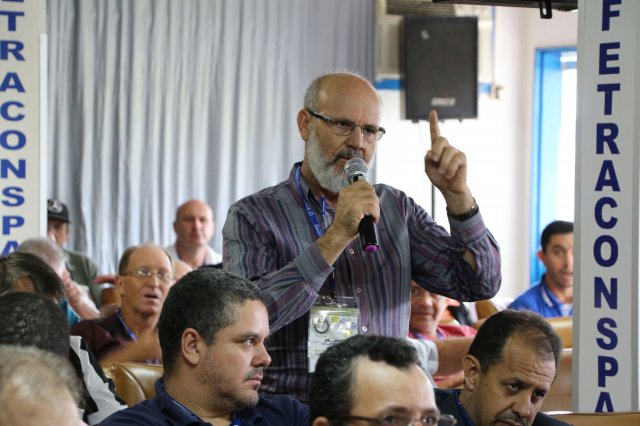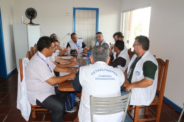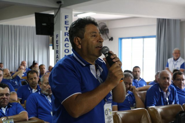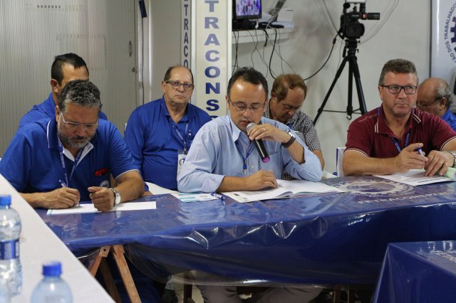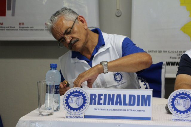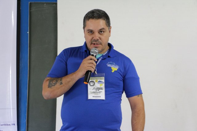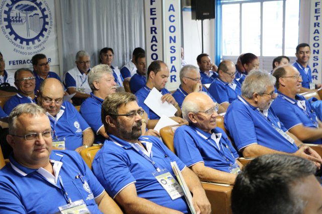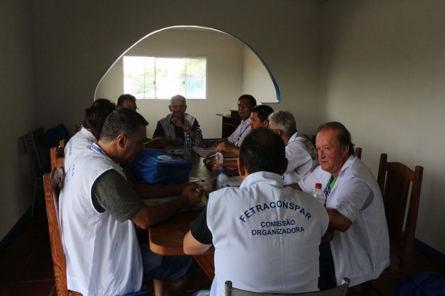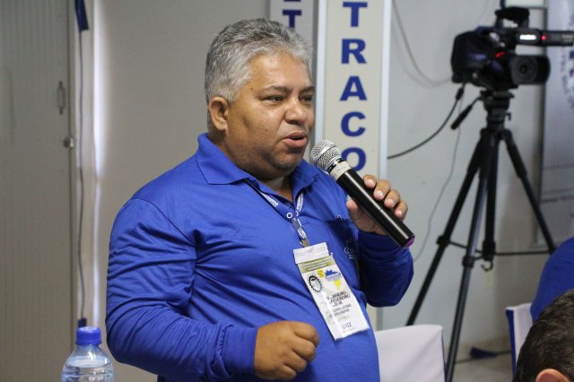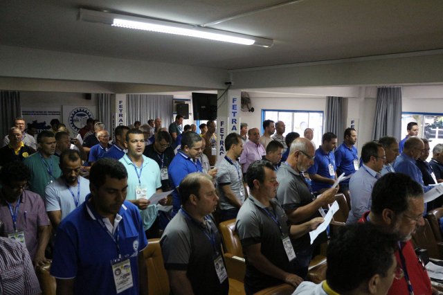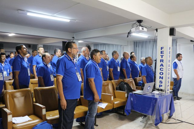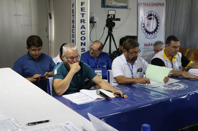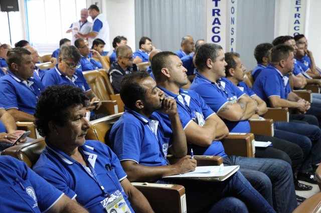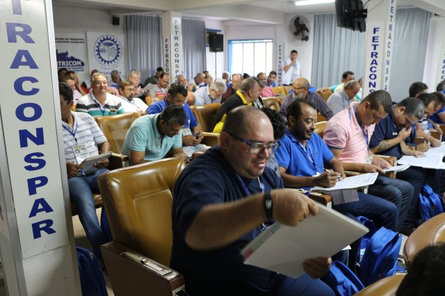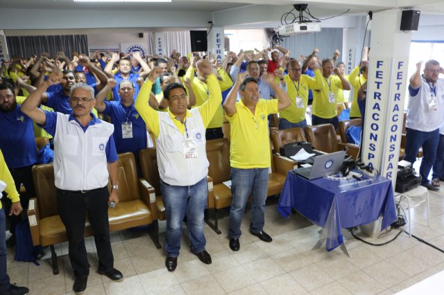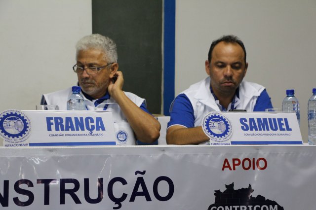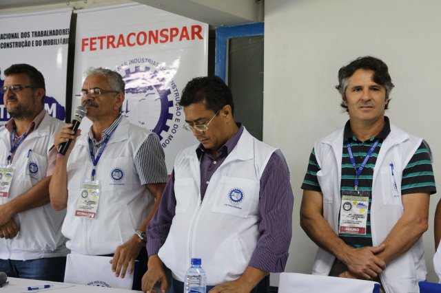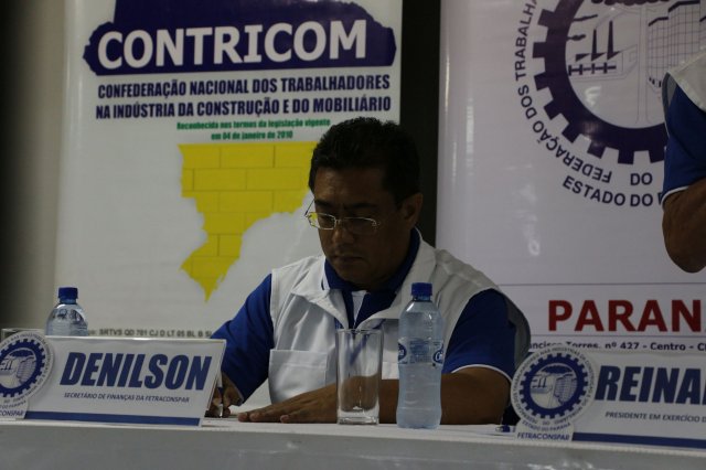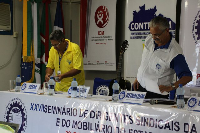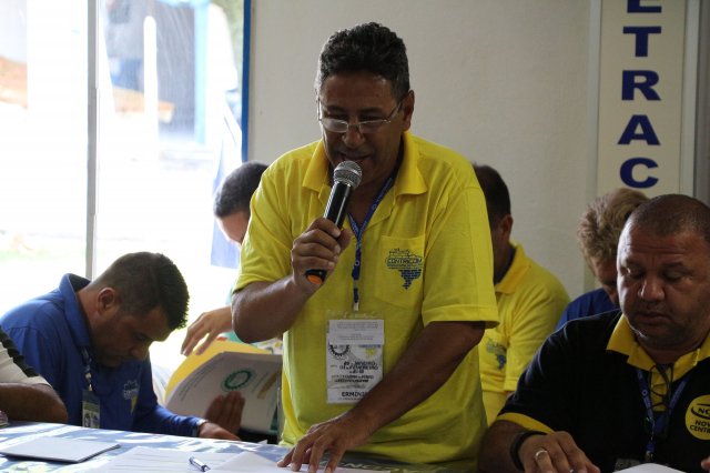 O primeiro dia do Seminário iniciou os trabalhos às 7h30 com o registro fotográfico dos participantes e a filmagem do grito de guerra que é marca de todas as atividades da FETRACONSPAR. Às 8h05, o Presidente em Exercício Reinaldim Barboza Pereira realizou a chamada dos inscritos e iniciou os informes gerais aos presentes. Ao todo, houve 86 inscrições de 38 sindicatos filiados.