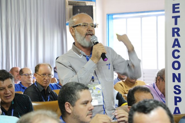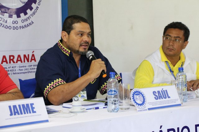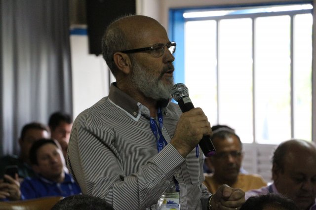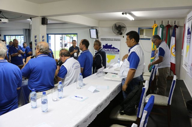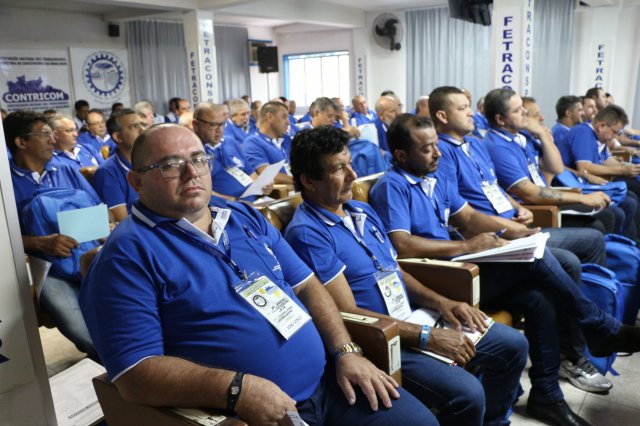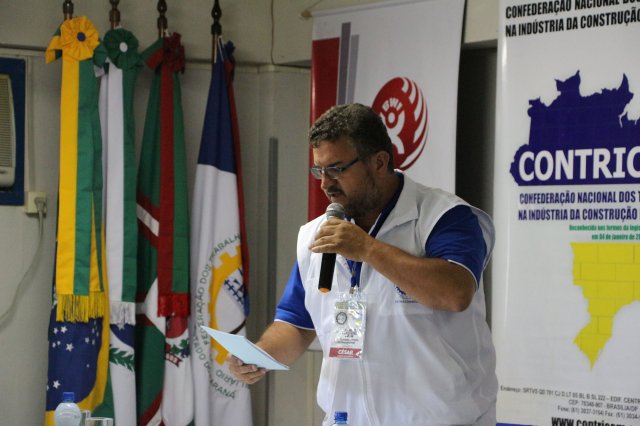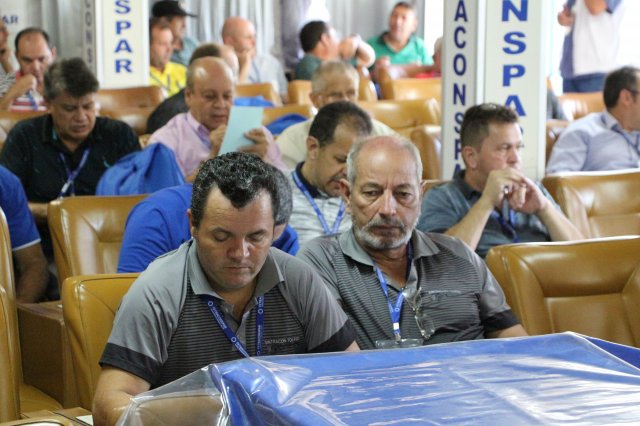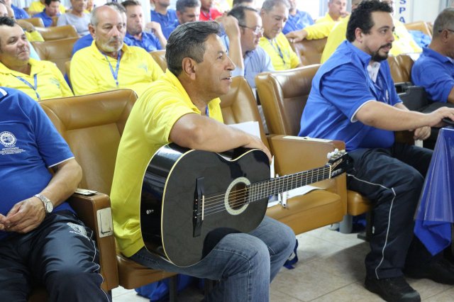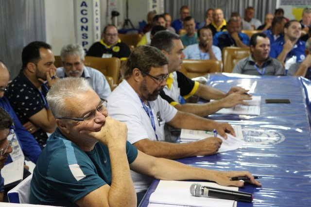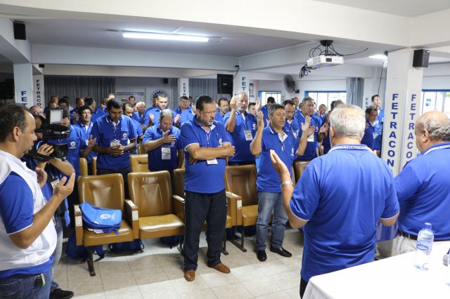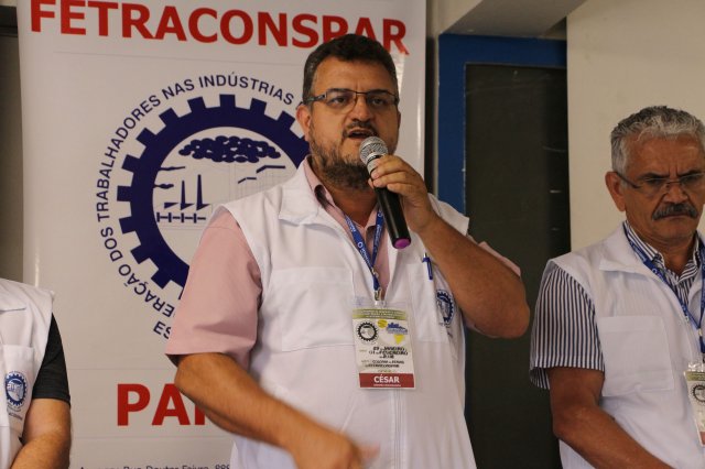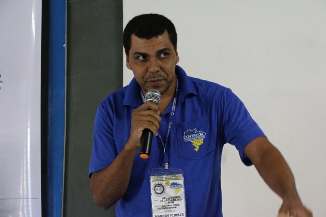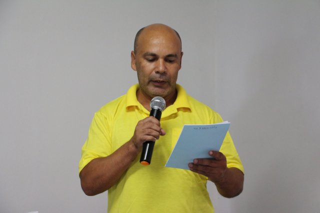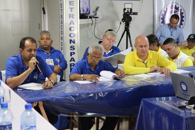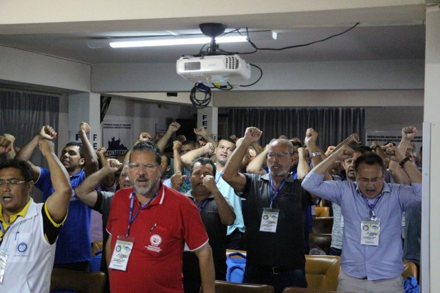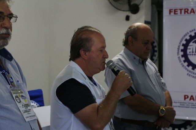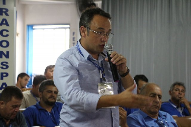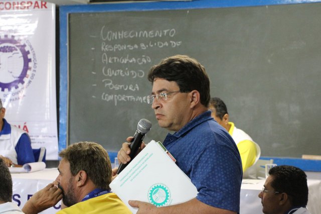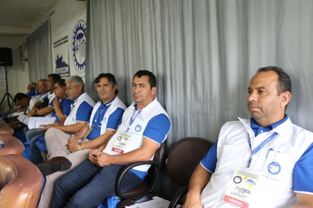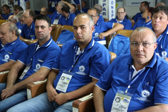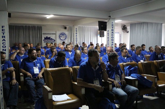 O primeiro dia do Seminário iniciou os trabalhos às 7h30 com o registro fotográfico dos participantes e a filmagem do grito de guerra que é marca de todas as atividades da FETRACONSPAR. Às 8h05, o Presidente em Exercício Reinaldim Barboza Pereira realizou a chamada dos inscritos e iniciou os informes gerais aos presentes. Ao todo, houve 86 inscrições de 38 sindicatos filiados.