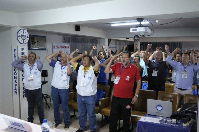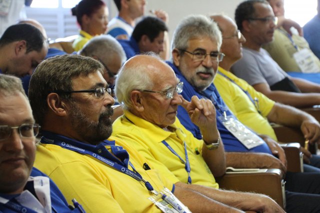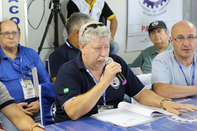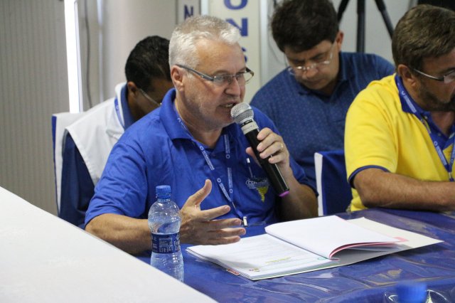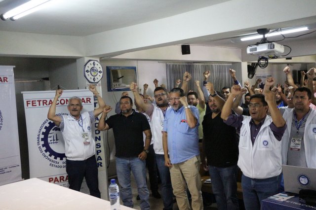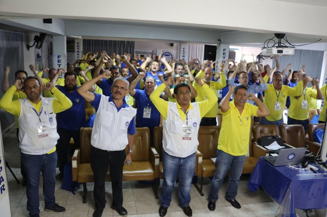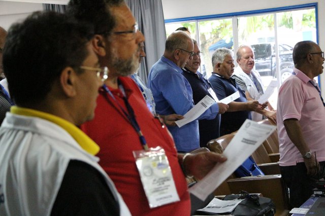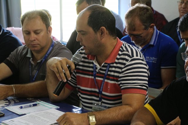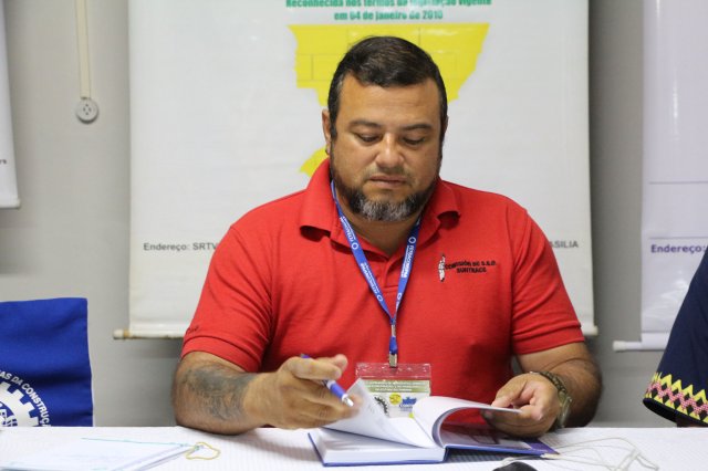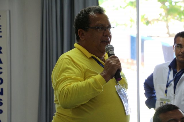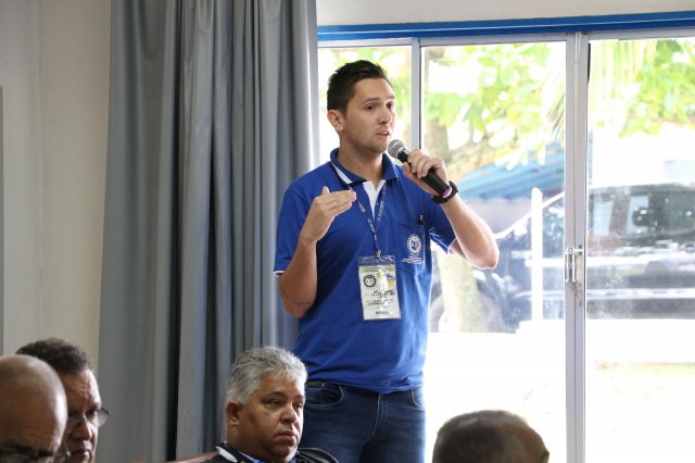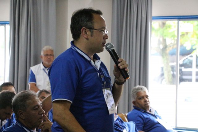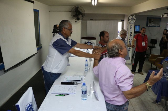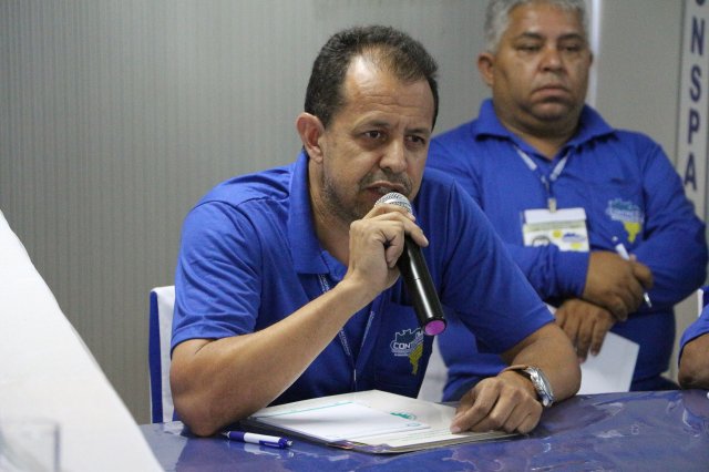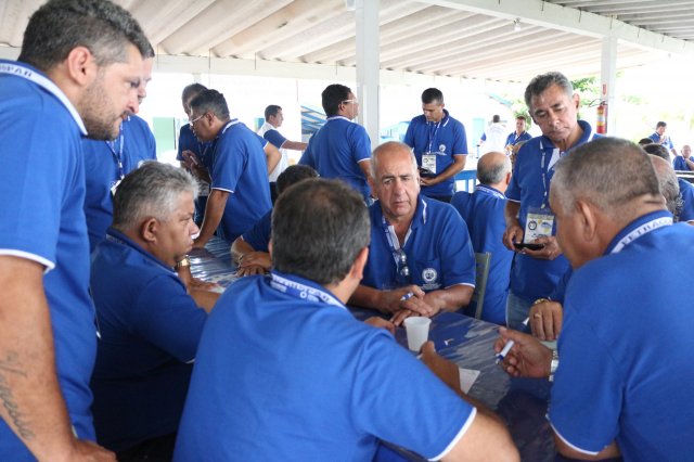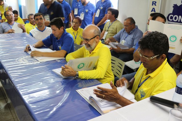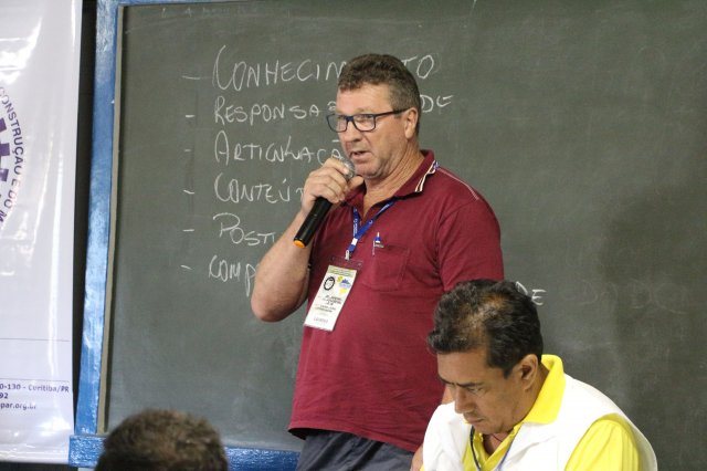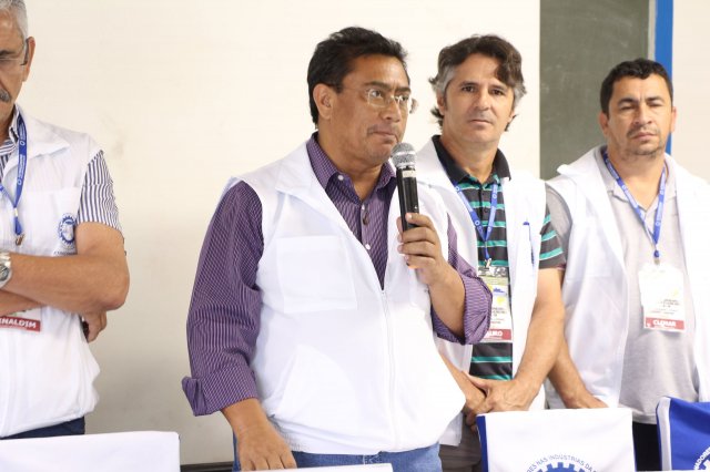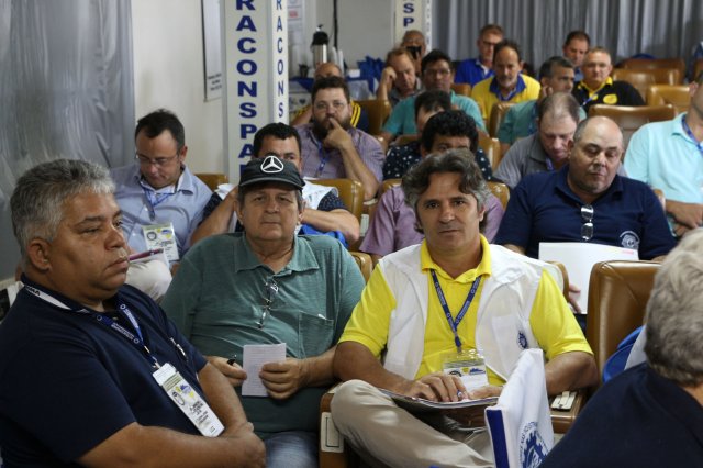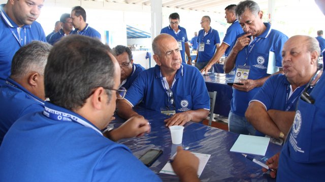 O primeiro dia do Seminário iniciou os trabalhos às 7h30 com o registro fotográfico dos participantes e a filmagem do grito de guerra que é marca de todas as atividades da FETRACONSPAR. Às 8h05, o Presidente em Exercício Reinaldim Barboza Pereira realizou a chamada dos inscritos e iniciou os informes gerais aos presentes. Ao todo, houve 86 inscrições de 38 sindicatos filiados.