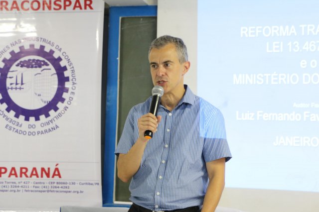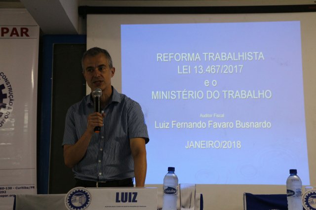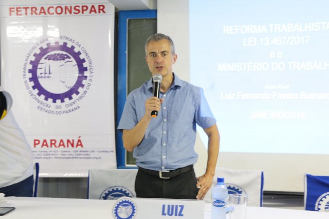 Depois do almoço oferecido aos participantes das 12h às 13h30, os trabalhos foram retomados com a palestra do Dr. Luiz Fernando Favaro Busnardo, Auditor-Fiscal e Chefe da Seção de Relações do Trabalho com o tema: "ATUAÇÃO DO MINISTÉRIO DO TRABALHO FRENTE À NOVA LEGISLAÇÃO TRABALHISTA."