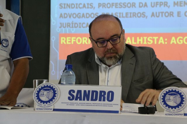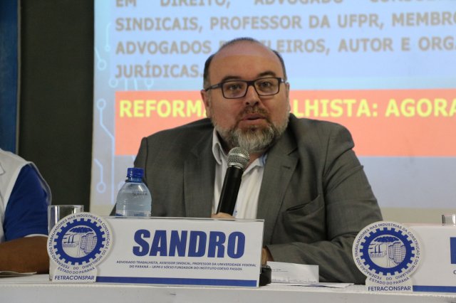 Em seguida a programação continuou com a palestra “REFORMA TRABALHISTA - AGORA, O QUE FAZER?”. A Palestra foi ministrada pelo Dr. Sandro Lunard Nicoladeli, Advogado Trabalhista, Assessor Sindical, Professor da Universidade Federal do Paraná – UFPR e Sócio Fundador do Instituto Edésio Passos.