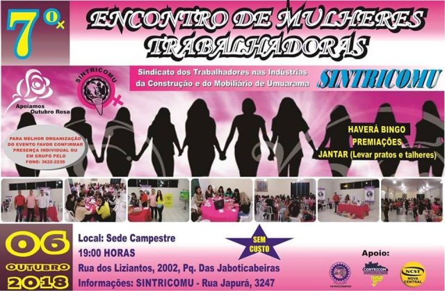 O SINTRICOMU - SINDICATO DOS TRABALHADORES NAS INDÚSTRIAS DA CONSTRUÇÃO E DO MOBILIÁRIO DE UMUARAMA, presidido pelo companheiro Marcos Antônio Beraldo, realizou no último dia 06/10/2018 às 19h00, na sede campestre do Sindicato, seu 7º Encontro de Mulheres Trabalhadoras da Construção e do Mobiliário.